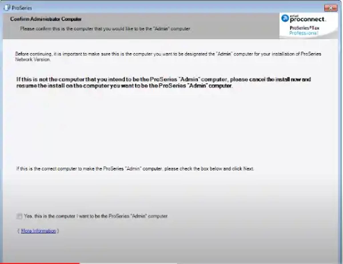 Step 7: The confirmation administrator window will be displayed. Click the box that reads, “Yes, this is the computer I want to be the ProSeries admin computer. Select “Next” to continue.