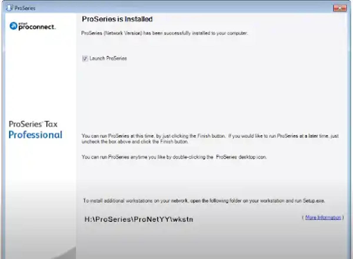 Step 13: Once the program has been installed, select the “Launch ProSeries” checkbox. Click “Finish” to launch the program.